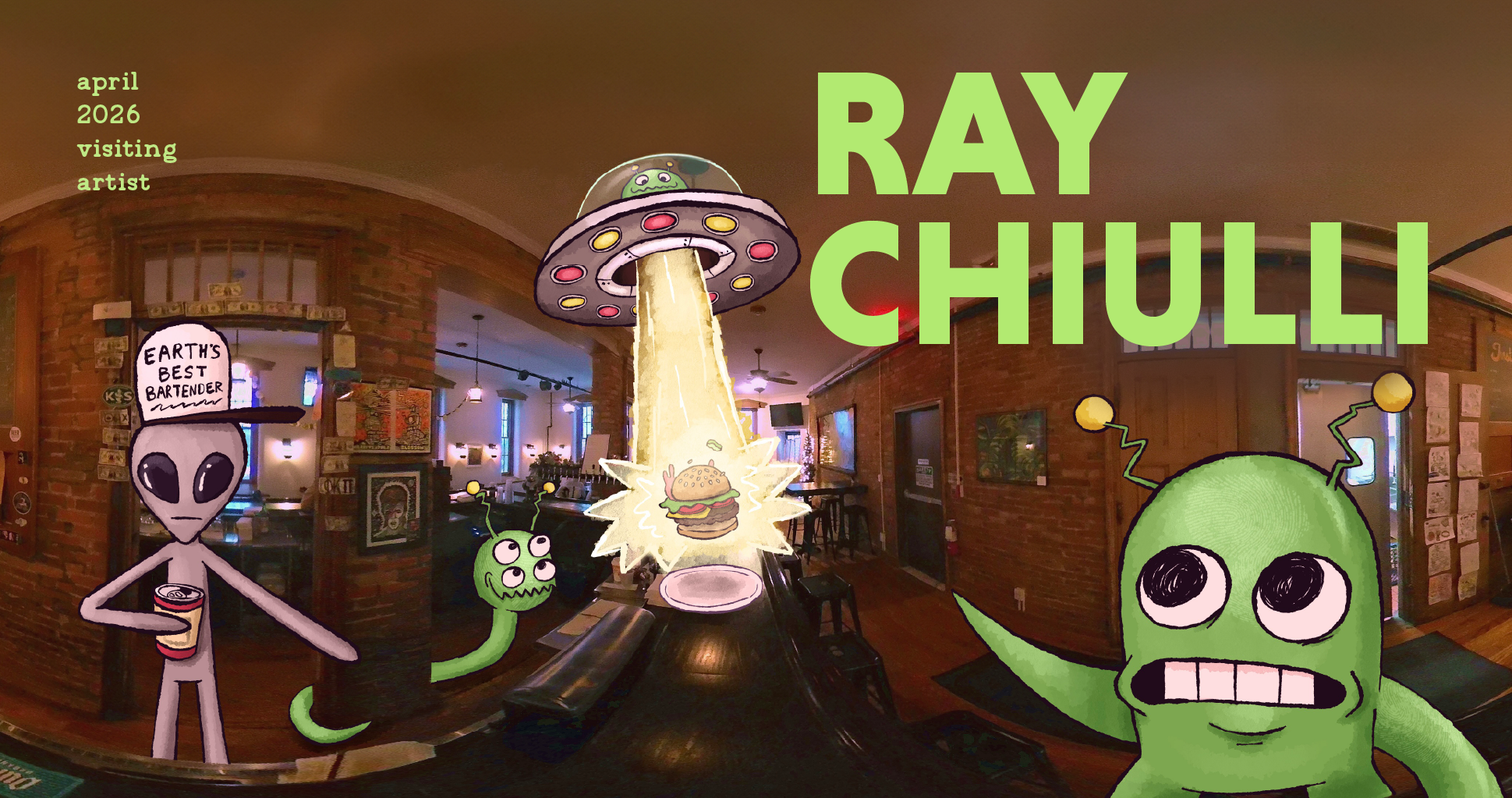 Ray will have a unique interactive show up on the wall this month. Back in December, we had a pop-up showing of a year-long project Ray worked on interjecting his cartoons into 3d panoramic photos of 8 local businesses. We'll have those super cool scenes up for you to check out all month, along with other animated works by Ray. Bring your phones and get ready to scan the QR codes next to each piece, which will allow you to step inside each character-infested scene and watch each illustration come to life.