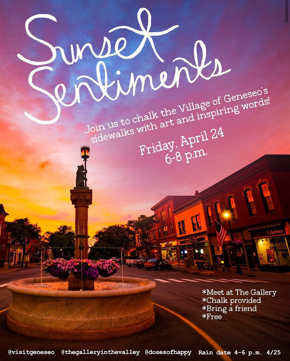 Back to All Events Sunset Sentiments Friday, April 24, 2026 6:00 PM 8:00 PM The Gallery in the Valley 79 Main Street Geneseo, NY 14454 United States (map) Google Calendar ICS CHALK THE WALK: Celebrate spring and join us on Main Street to spruce up the sidewalks of Geneseo! All you have to bring is yourself & some inspiration (or don’t, Main Street’s got plenty of that all around)!