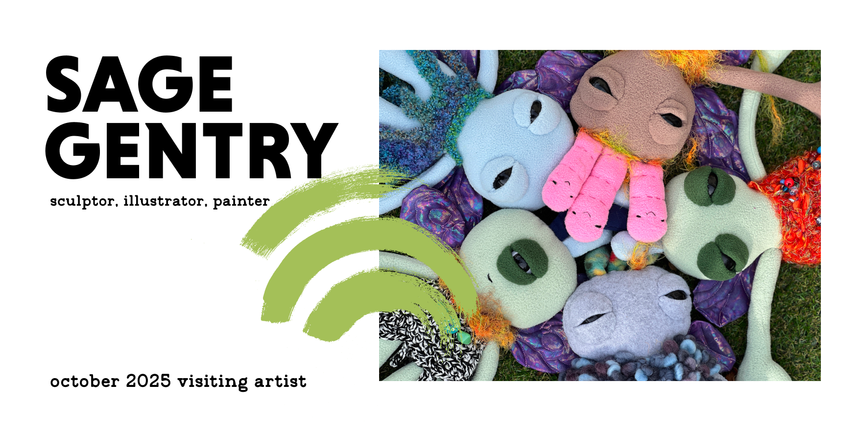 Sage Gentry is an artist living and working in Rochester NY. They create assemblage work with a focus in soft sculpture. Primarily illustrative, Sage’s work acts as a form of escapism through their use of world building. Each work has a visual narrative linking them together. They bring that world into the physical plane through sculpture, drawing, and painting. Inspired by stop motion animation and puppeteering, Sage creates personified objects that will surely be your friend.